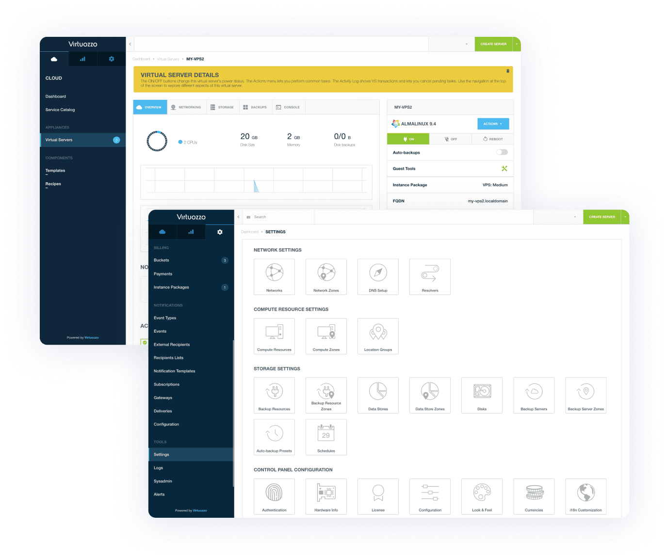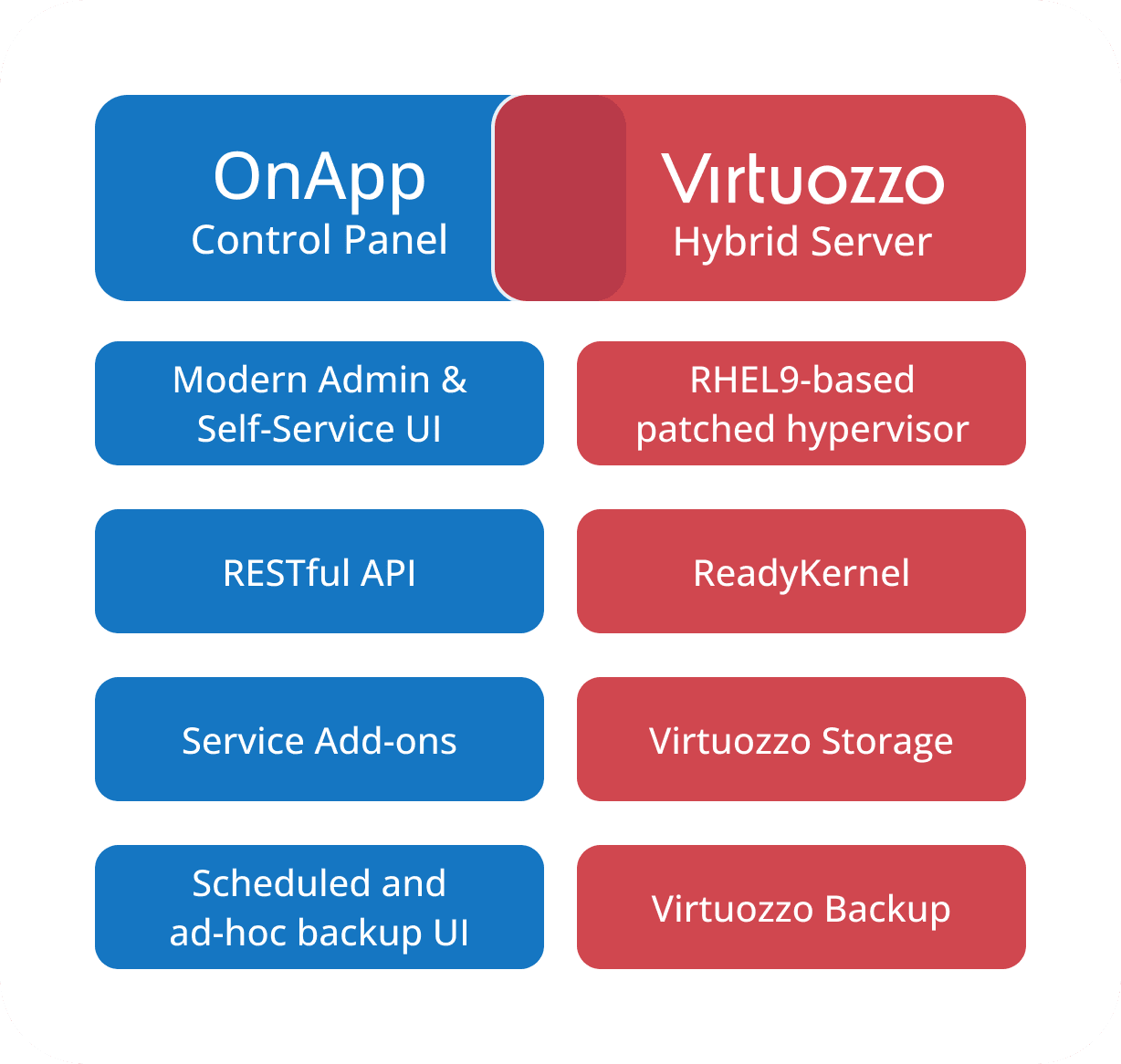 Virtuozzo Hybrid Server 9 integrates the advanced RHEL9-based Virtuozzo KVM hypervisor with the intuitive web UI and cluster-wide orchestration from OnApp, to create a powerful and user-friendly experience.