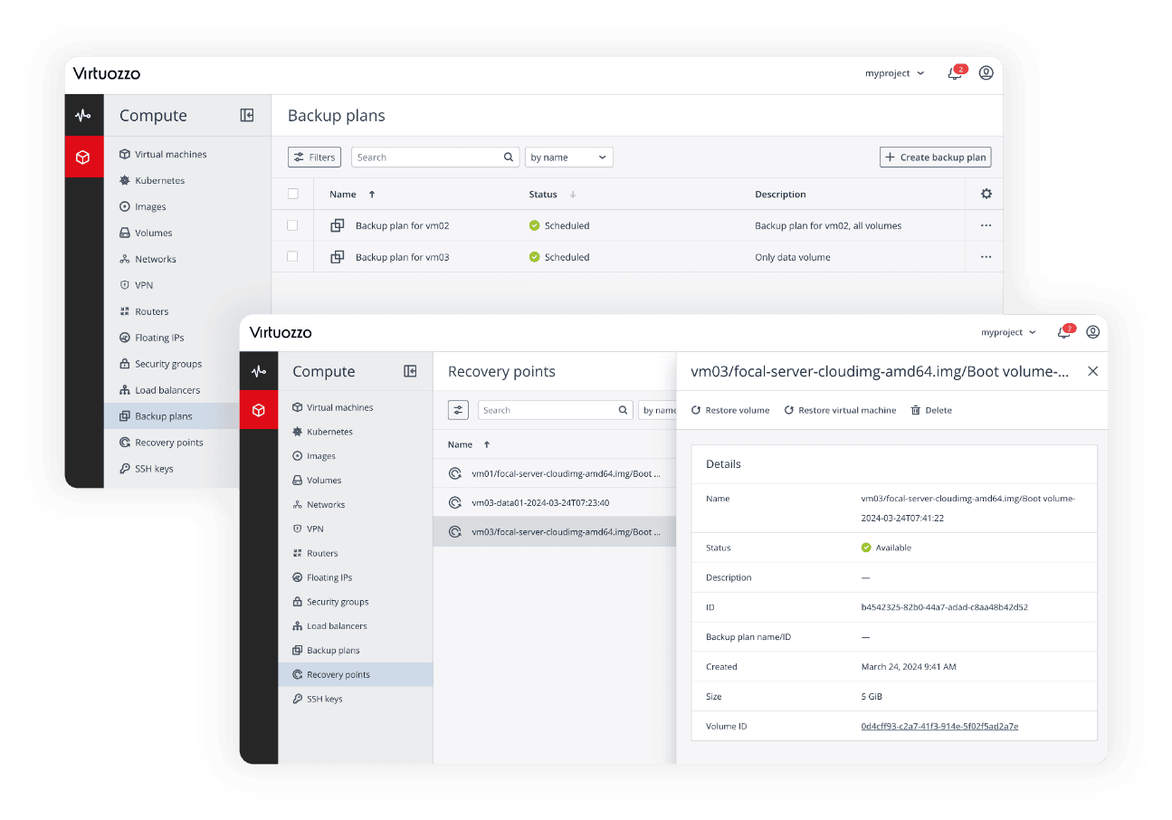 - Crash-consistent backup for both root and secondary volumes, easily managed by end-users through the self-service panel, or via the OpenStack API